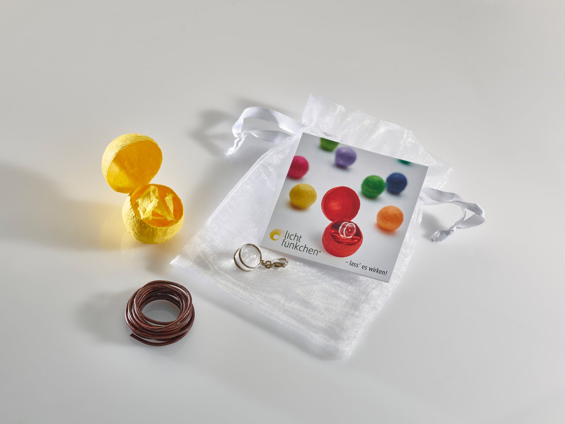 Puristisch gestalteter Anhänger mit Karabiner und einer frei beweglichen, klaren und lichtdurchlässigen Bergkristallkugel. Der Anhänger ist in einer kreativen, farbigen Kugelverpackung nochmals separat verpackt. In der Kugelverpackung befindet sich zusätzlich unter diesem Anhänger ein Lederband, damit das Lichtfünkchen sofort getragen werden kann.